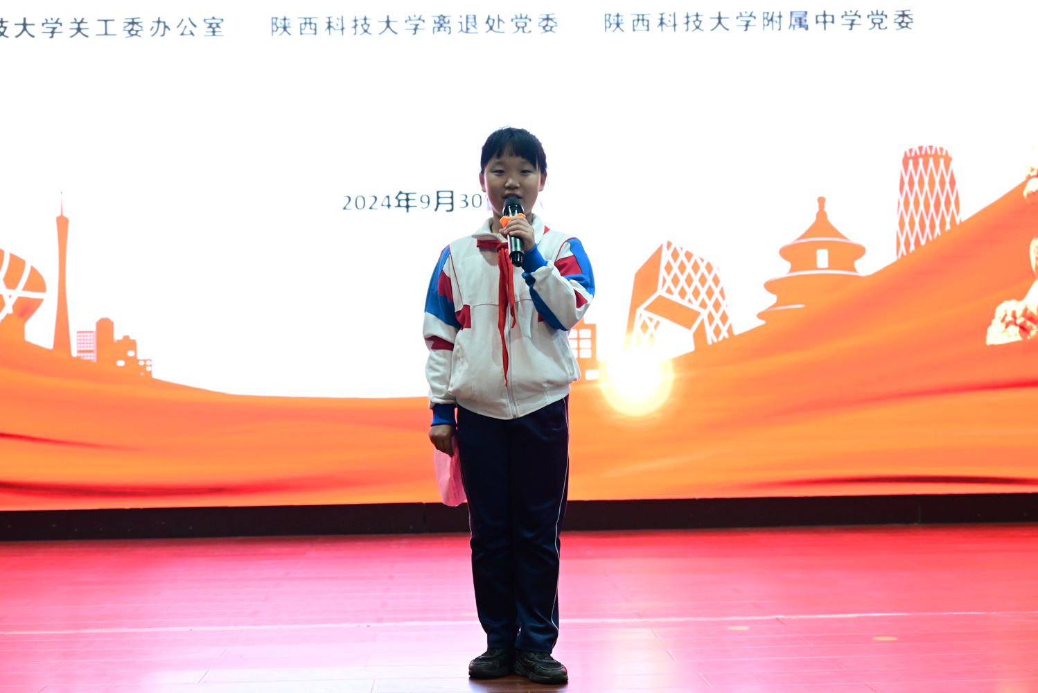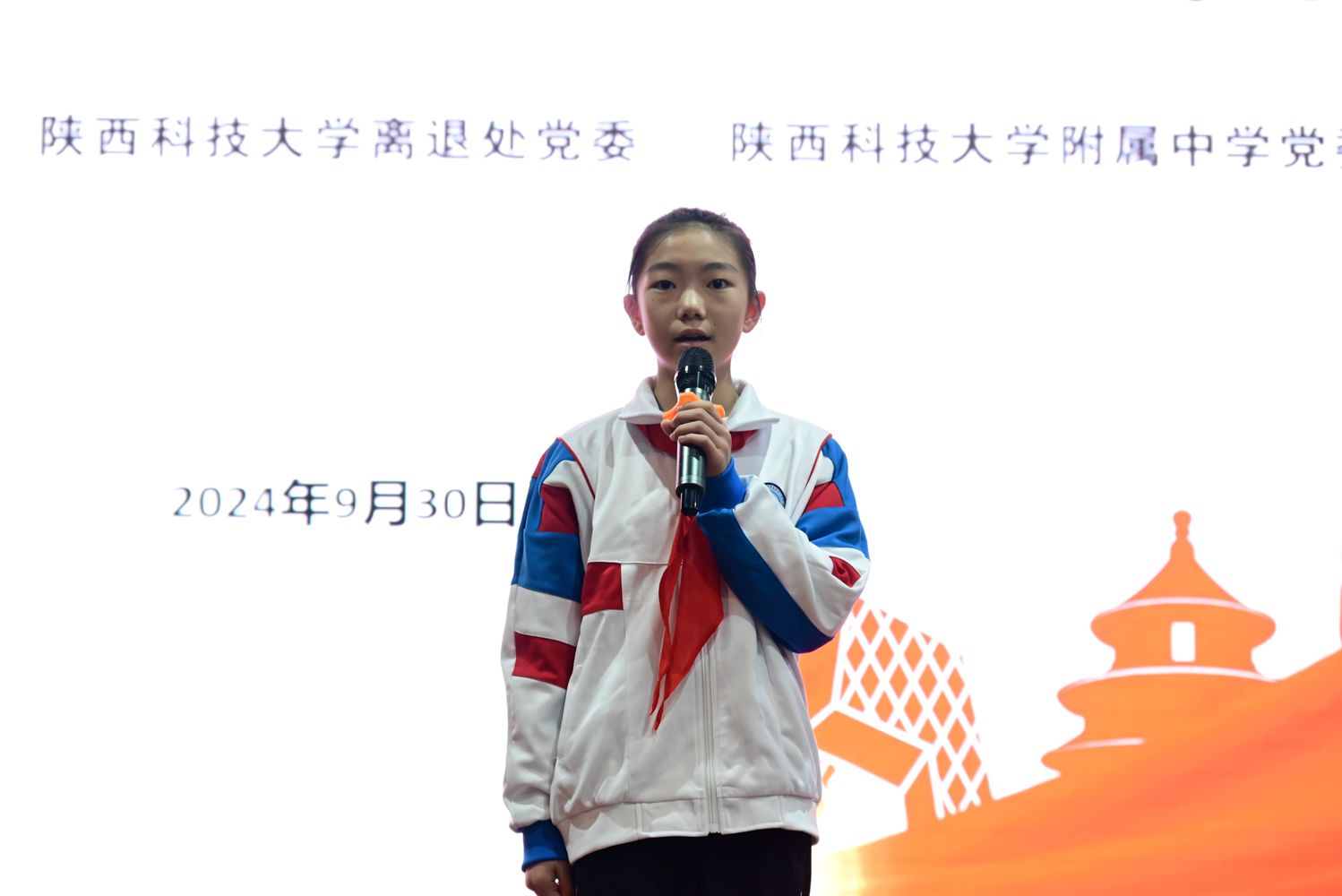 學(xué)生代表譚語桐同學(xué)領(lǐng)誦社會(huì)主義核心價(jià)值觀及陜西科技大學(xué)附屬中學(xué)校訓(xùn)、校風(fēng)及學(xué)風(fēng)。她情緒飽滿、語氣堅(jiān)定,表達(dá)了對(duì)學(xué)校、對(duì)祖國的熱愛和對(duì)未來的憧憬。
