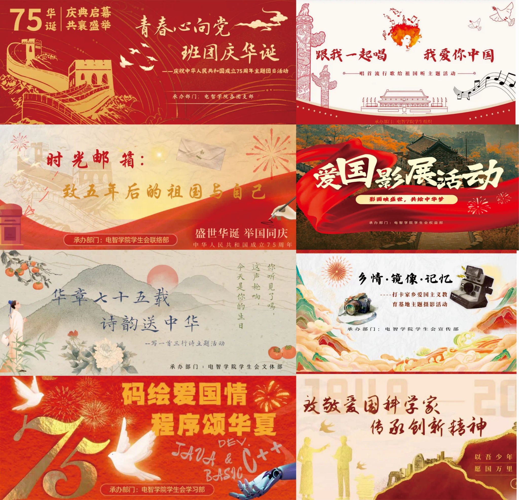 各學(xué)生團(tuán)支部組織開展“青春心向黨,班團(tuán)慶華誕”、拍攝錄制《我愛你中國》MV、“時(shí)光郵箱:致五年后的祖國與自己”明信片國慶寄語等主題團(tuán)日活動(dòng),引導(dǎo)電智學(xué)子在推進(jìn)強(qiáng)國建設(shè)、民族復(fù)興偉業(yè)中展現(xiàn)青春作為、彰顯青春風(fēng)采、貢獻(xiàn)青春力量。