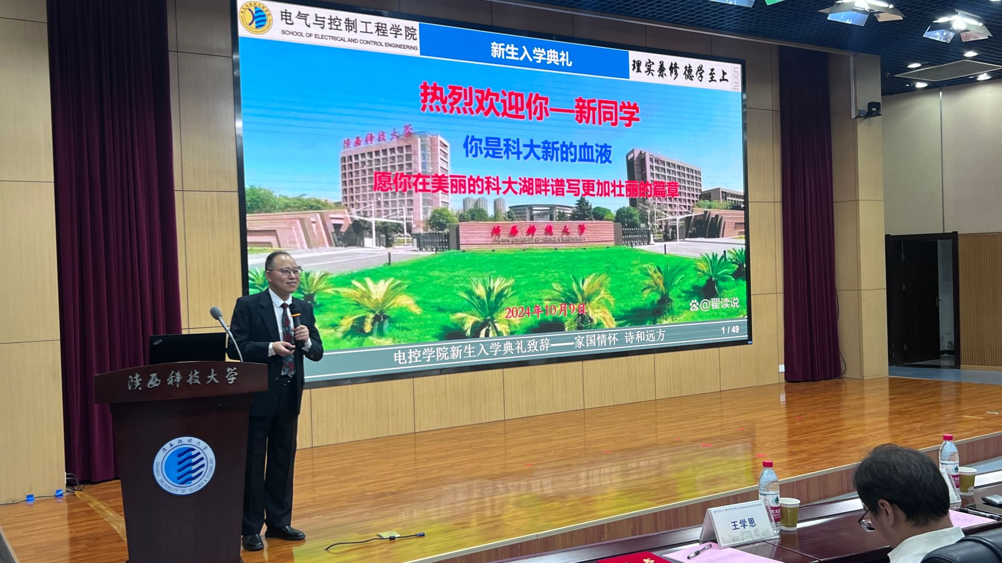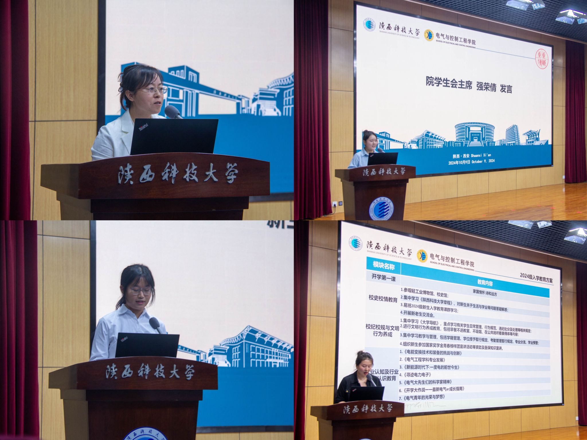 會上,院長助理田雨杰以“砥礪前行,成就未來”為主題寄語新生,指導新生們在大學期間通過積極參加學院科創(chuàng)競賽、社會實踐和公益志愿服務等活動,逐漸轉變?yōu)橐幻麅?yōu)秀的大學生,不斷提升自身綜合素質和實踐能力。學院學生會主席強榮倩作為電控優(yōu)秀學生代表,從學習、生活、提升自身能力三個方面為新生們分享經驗。新生代表張佳穎發(fā)出倡議,在大學學習生活中要將自己的理想融入到國家發(fā)展的大局中,用實際行動書寫屬于新時代電控青年的篇章。輔導員李靜從向各位新生介紹了《電控學院2024級本科生入學教育實施方案》,使全體新生明確了入學教育的內容及意義。