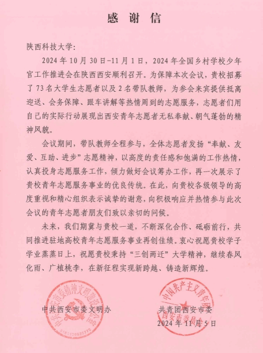 近日,中共西安市委文明辦、共青團(tuán)西安市委給我校發(fā)來感謝信,對我校在2024年全國鄉(xiāng)村學(xué)校少年宮工作推進(jìn)會中的大力支持表示感謝,對我校志愿者在本次會議中的志愿服務(wù)給予了高度肯定。