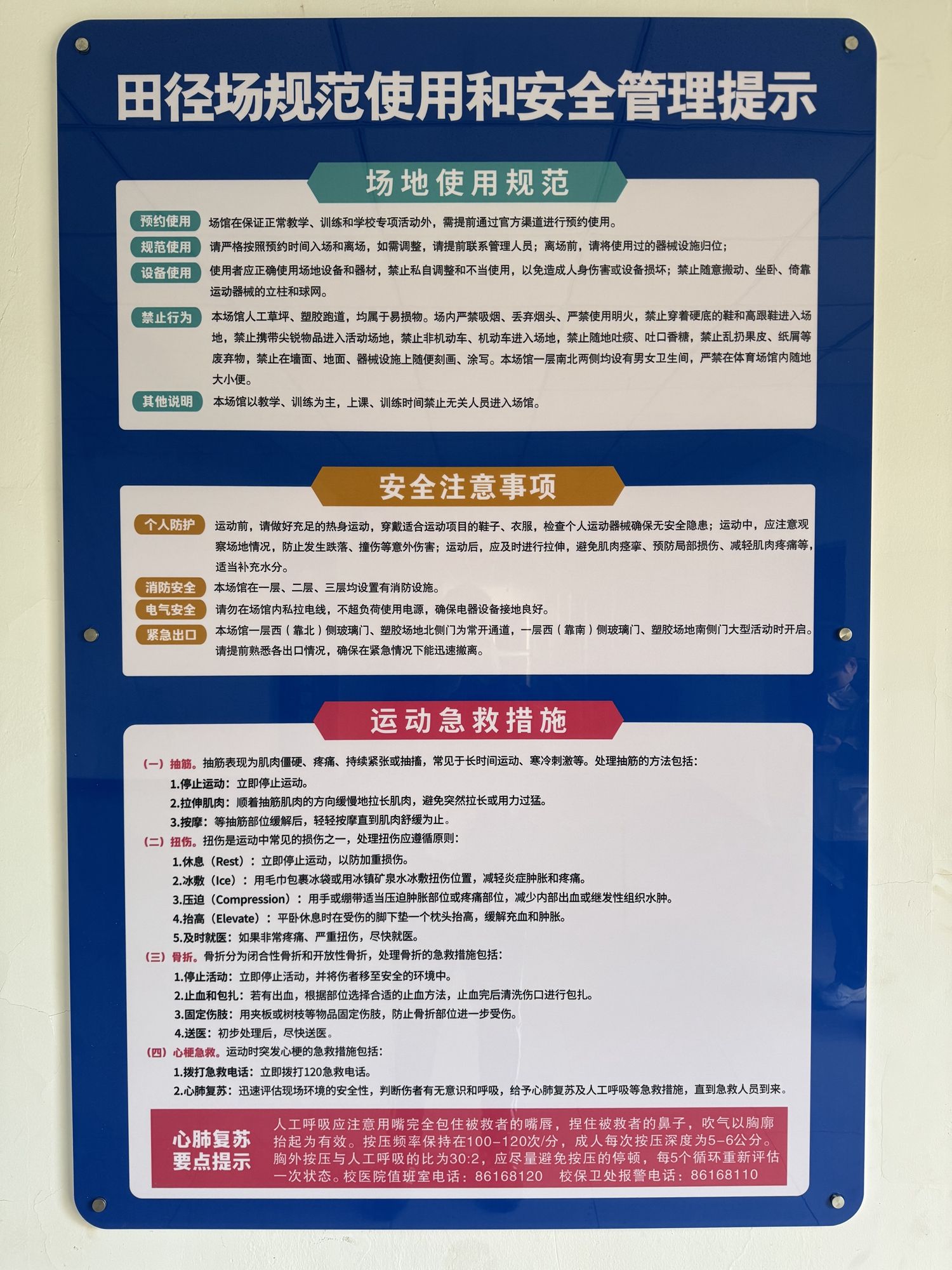 為進一步提高師生運動的安全防護,體育部組織對北區(qū)體育館燈光進行升級更換,在所有體育場館內(nèi)顯著位置安裝安全提示三色板,通過強調(diào)場館規(guī)范使用說明、場館使用安全注意事項、運動損傷急救等內(nèi)容,提醒使用者注意安全事項,增強自我保護意識。堅持常態(tài)化的場地安全檢查制度,專人記錄檢查結(jié)果,及時建立工作臺賬,跟蹤場地設施問題整改,從問題發(fā)現(xiàn)到問題解決實現(xiàn)閉環(huán)管理,確保隱患無處遁形。