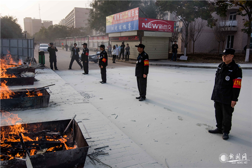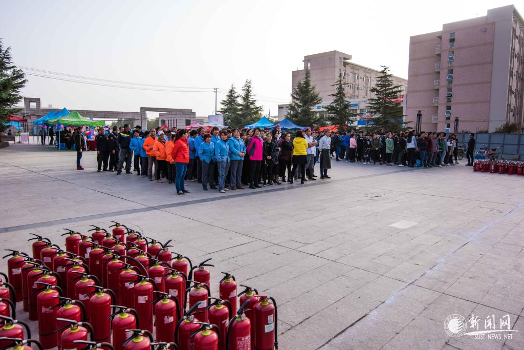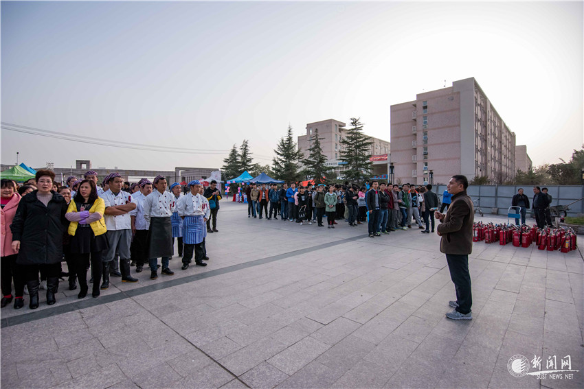 參與演練的一線后勤職工與大學(xué)生代表來到沁園廣場上排列好隊(duì)伍等待演練。一排排干粉滅火器擺放整齊。保衛(wèi)人員準(zhǔn)備好了現(xiàn)場室外油盆滅火演練的工具。