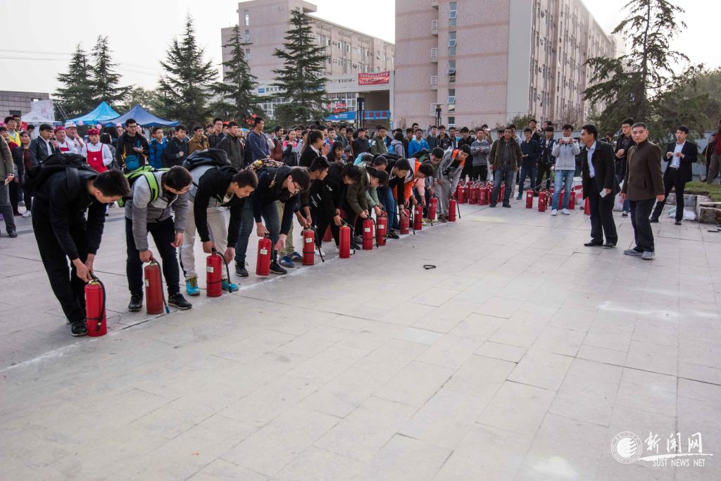 保衛(wèi)人員給大家發(fā)放滅火器,參與演練的大學(xué)生在仔細(xì)查看干粉滅火器的閥門。