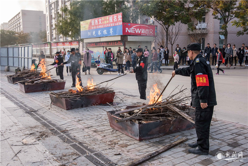 后勤人員進(jìn)行演練,將滅火器對準(zhǔn)火堆,拉下保險(xiǎn)。