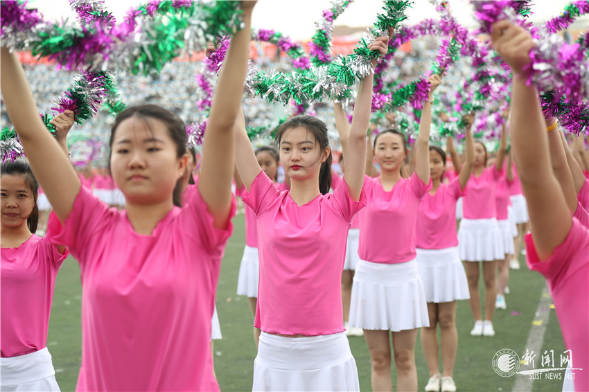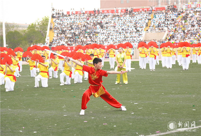 開幕式上,我校國(guó)旗護(hù)衛(wèi)隊(duì)隊(duì)員們身著制服,踏著整齊步伐入場(chǎng),各學(xué)院的運(yùn)動(dòng)員方陣英姿勃發(fā),高舉院旗緊隨其后。其中化工學(xué)院學(xué)生身著實(shí)驗(yàn)服,科研氣息濃厚;經(jīng)管學(xué)院少數(shù)民族學(xué)生鮮艷的民族特色服飾吸引全場(chǎng)目光。開幕表演中,400名女大學(xué)生身著粉衣白裙,手持彩色花圈,伴著“擼起袖子加油干”的音樂(lè)跳起活力四射的團(tuán)體操。400名武術(shù)健兒揮舞火紅折扇,武術(shù)表演剛勁激昂,精彩紛呈。