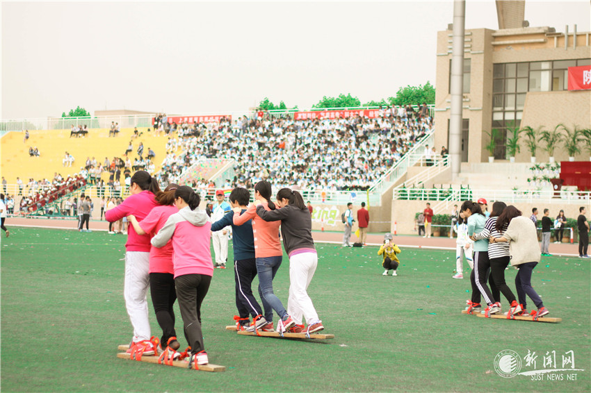 9:20,三人踏板競(jìng)速比賽中,各組教師們團(tuán)結(jié)協(xié)作,各顯其能。走在最前面的一組老師們邁步有力、節(jié)奏鮮明、配合默契。其他組老師們也絲毫不懈怠,她們目光堅(jiān)定,口中喊著整齊的口令。觀賽師生們也都被現(xiàn)場(chǎng)的氛圍感染,為他們加油。