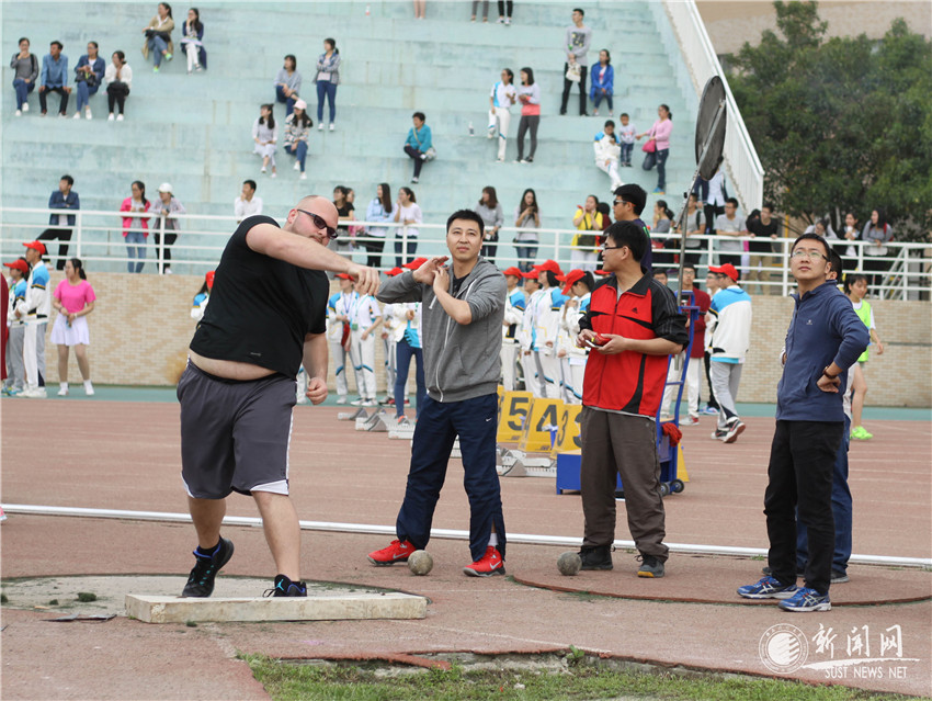 喝彩聲中,教工青年組鉛球比賽正在進(jìn)行。選手們以頑強(qiáng)拼搏的運(yùn)動(dòng)精神,奮力拋出手中的鉛球。最終,電信教工丁磊拋出9.7米的好成績(jī),拔得頭籌。參加比賽的唯一一位外籍教師ronald分外亮眼,他拋出了8米多的好成績(jī)。