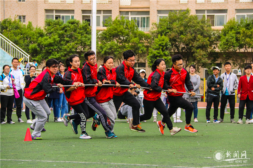 11:30,大學(xué)生組進(jìn)行了男女七人龍卷風(fēng)比賽。比賽時(shí),每個(gè)組七位選手們雙手握住同一根桿向著五個(gè)膠樁進(jìn)行圓周運(yùn)動(dòng),像龍卷風(fēng)一般。最后,機(jī)電學(xué)院、經(jīng)管學(xué)院、輕工學(xué)院獲得前三名。