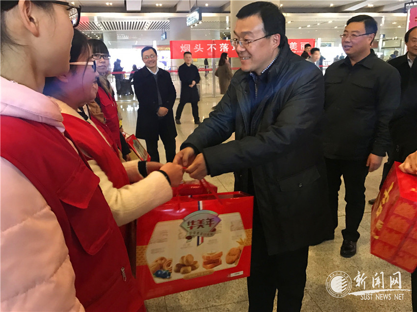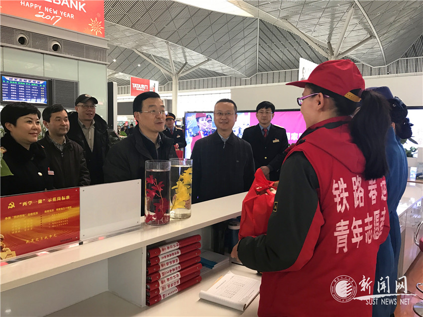 1月26日下午,在農(nóng)歷春節(jié)即將來(lái)臨之際,共青團(tuán)陜西省委書(shū)記段小龍,團(tuán)省委黨組成員、省少先隊(duì)總輔導(dǎo)員趙大勝等一行來(lái)到西安北客站慰問(wèn)我校60名春節(jié)期間堅(jiān)守在春運(yùn)志愿服務(wù)工作第一線的大學(xué)生志愿者,并向他們送去慰問(wèn)品和新春的祝福。