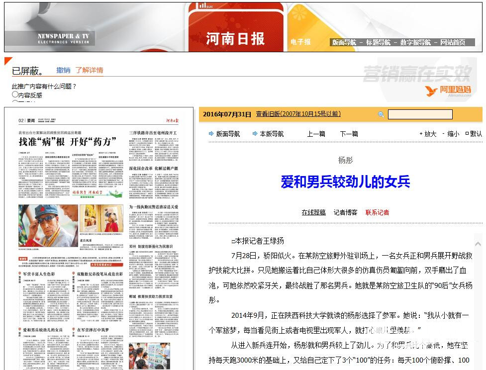 2016年7月31日,河南日報、新華網(wǎng)、鳳凰財經(jīng)等多家媒體以《愛和男兵較勁兒的女兵》為題對楊彤進(jìn)行采訪報道。