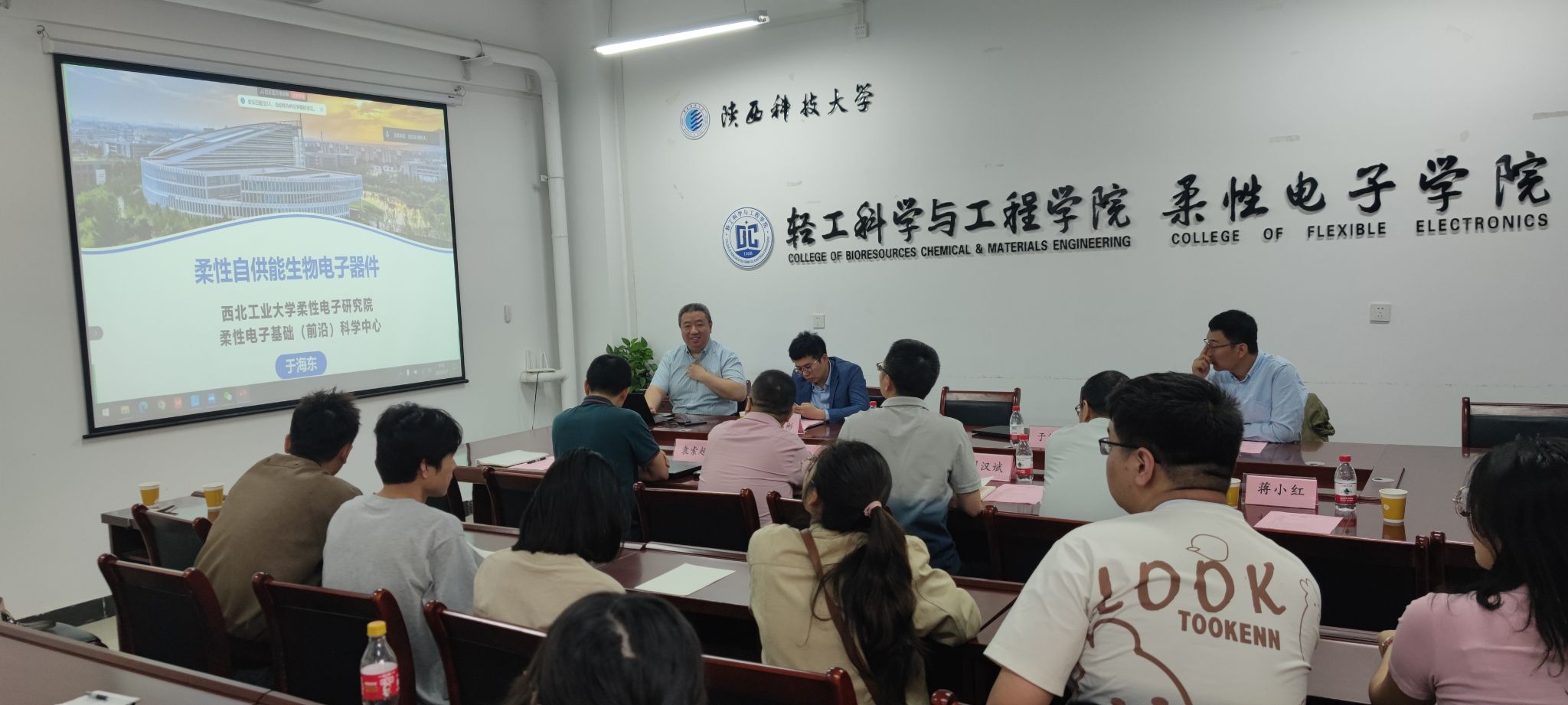 會議初始,劉國棟教授對西工大柔電院五位老師表示歡迎,簡要介紹了本次交流會的主要議程和重要意義。于海東、徐巍棟、吳忠彬和馬龍濤四位教授,分享了 “柔性自供能生物電子器件”“高功率鈣鈦礦發(fā)光”“有機與鈣鈦礦發(fā)光晶體管”以及“高比能、高安全鋅基電池”的精彩學術報告。與此同時,輕工學院袁索超教授也作了題為“光場成像技術研究進展”的報告,雙方就相關研究成果展開了深入的討論與交流。交流結(jié)束后,輕工學院青年教師張文亮、蔣小紅兩位老師分別匯報了各自基金申報的思路和存在的問題,與會教授結(jié)合各自的經(jīng)驗,針對性地提出了建設性的意見和建議,為提升基金申請書的質(zhì)量提供重要參考。