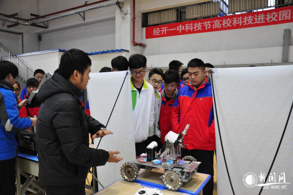 11月24日,我校走進西安市經(jīng)開一中,組織大學生科技創(chuàng)新作品參加該校第二屆科技節(jié)?;顒又形倚Ec西北工業(yè)大學、長安大學、西安電子科技大學、西安理工大學、西安工業(yè)大學共六所高校集中進行了展示和表演。我校參展作品吸引了眾多師生的目光,電信學院指導教師和參展學生團隊現(xiàn)場演示了履帶式機器人、四軸飛行器、步兵機器人等三件科技創(chuàng)新作品。在演示過程中,不但為高中生詳細講述了參展作品原理、操作方法和功能,發(fā)放了作品說明和宣傳材料,而且進行了面對面的互動與交流,反響熱烈,氣氛活躍。當場有學生表示希望自己能到學校深造,可以親自動手參加科技創(chuàng)新作品設計制作來實現(xiàn)自己的夢想。