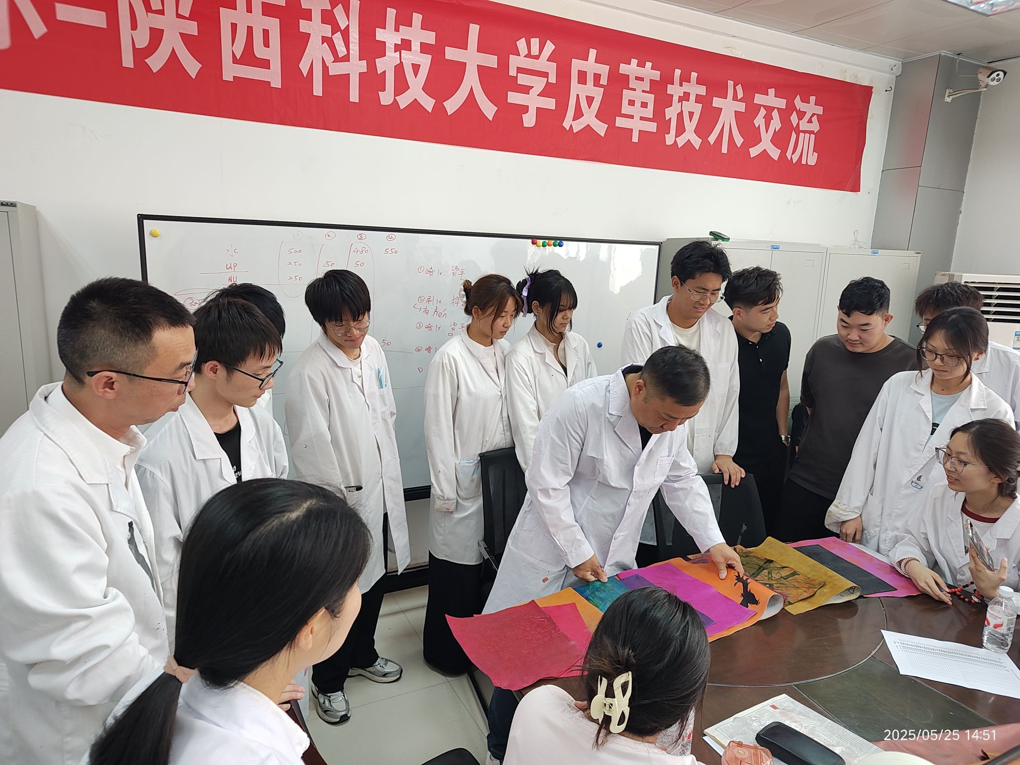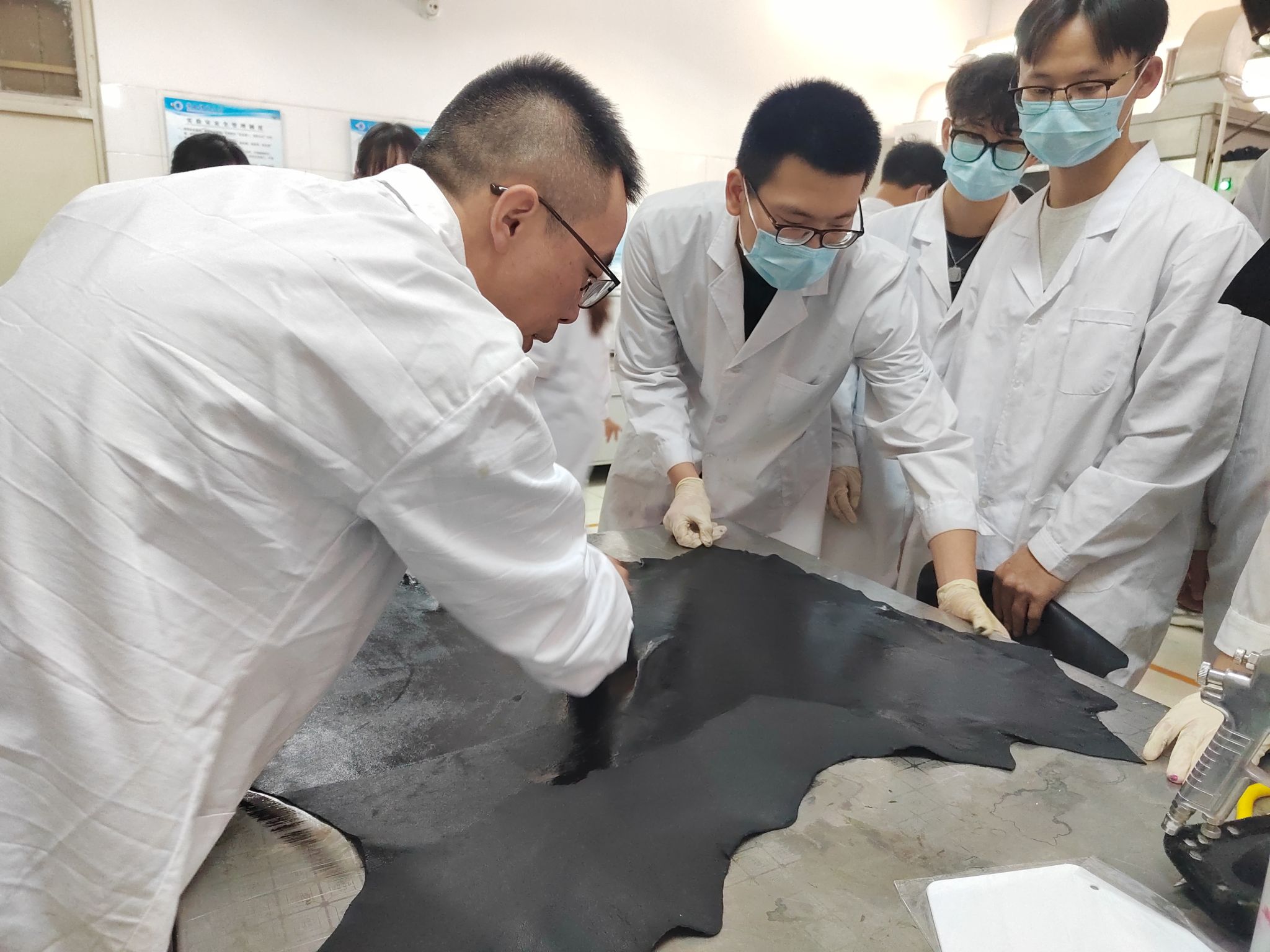 交流期間,夏敏、涂剛和費必江給輕化工程專業(yè)(皮革)師生做了主題報告, 分別為斯塔爾公司介紹、皮革市場最新發(fā)展以及市場流行皮革產(chǎn)品涂飾方案。隨 后,在學(xué)院專業(yè)實驗室,夏經(jīng)理、涂經(jīng)理、費經(jīng)理手把手地指導(dǎo)學(xué)生完成扎染、 油蠟、納帕三種皮革涂飾效應(yīng)的制作。在整個實驗過程中,學(xué)生積極思考、參與 度極高,把自己的奇思妙想融入實驗中,深度體驗并踐行了皮革涂飾“技術(shù)與藝 術(shù)融合”的理念。