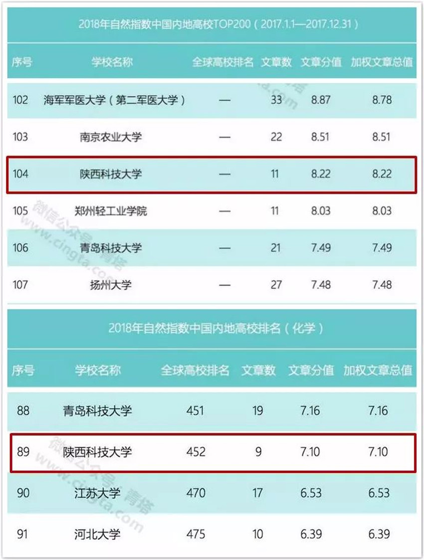 陜科大在“中國(guó)內(nèi)地高校2018自然指數(shù)排行榜”中位居全國(guó)高校104名