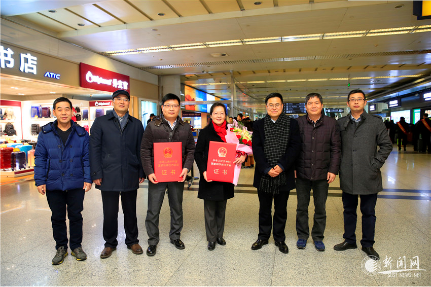 2018年1月8日,從北京人民大會(huì)堂傳來(lái)喜訊——在剛剛結(jié)束的2017年度國(guó)家科學(xué)技術(shù)獎(jiǎng)勵(lì)大會(huì)上,由陜西科技大學(xué)張美云教授主持的創(chuàng)新性研究成果“高性能纖維紙基功能材料制備共性關(guān)鍵技術(shù)與應(yīng)用”榮獲國(guó)家科學(xué)技術(shù)進(jìn)步二等獎(jiǎng)。在京領(lǐng)獎(jiǎng)期間,張美云教授受到了習(xí)近平等黨和國(guó)家領(lǐng)導(dǎo)人親切會(huì)見(jiàn),并合影留念。1月9日下午,校長(zhǎng)馬建中、副校長(zhǎng)李志健前往機(jī)場(chǎng),迎接參加2017年度國(guó)家科學(xué)技術(shù)獎(jiǎng)勵(lì)大會(huì)載譽(yù)歸來(lái)的張美云教授及團(tuán)隊(duì)成員。