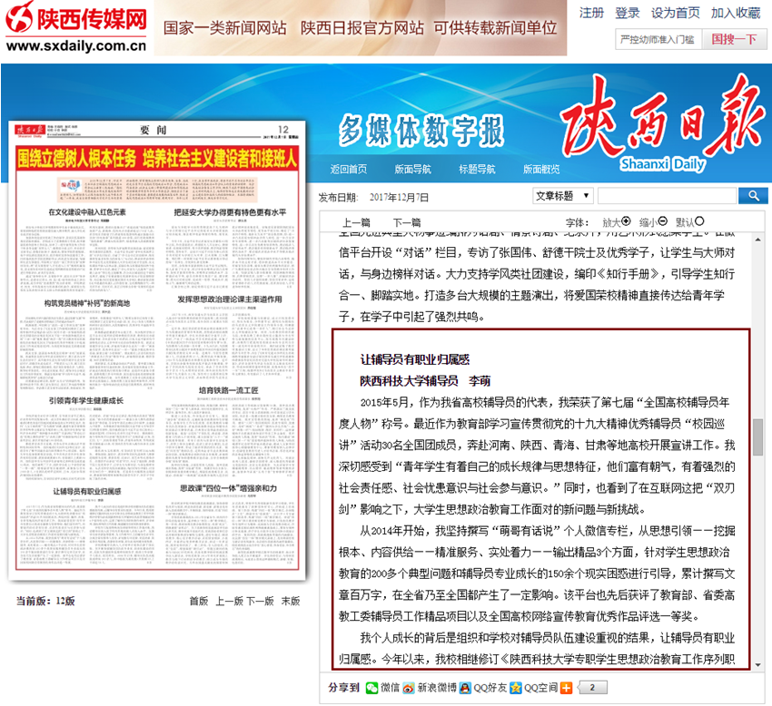 12月5日,全省高校貫徹落實習(xí)近平總書記去年12月7日在全國高校思想政治工作會議上的重要講話精神座談會召開。省委常委、省委宣傳部部長莊長興出席并講話。 我校學(xué)生工作干部李萌出席會議并做了主題發(fā)言,12月7日,陜西日報刊登其發(fā)言內(nèi)容。