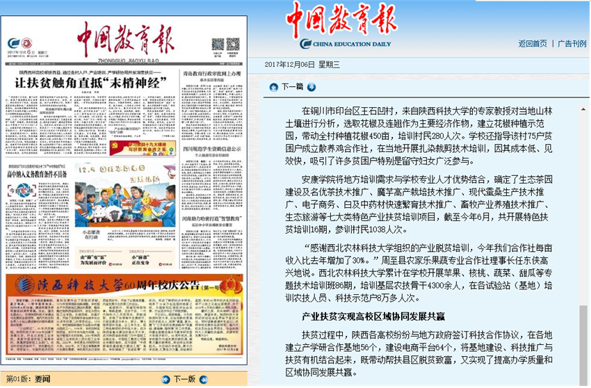 12月6日,《中國教育報》在頭版頭條刊發(fā)的報道《陜西百所高校幫扶百縣,通過走村入戶、產(chǎn)業(yè)培訓(xùn)、產(chǎn)學(xué)研協(xié)同開展深度扶貧——讓扶貧觸角直抵“末梢神經(jīng)”》中,報道了我校在銅川市印臺區(qū)王石凹村,通過開展多種形式的特色產(chǎn)業(yè)培訓(xùn),增強(qiáng)貧困地區(qū)的“造血”功能。