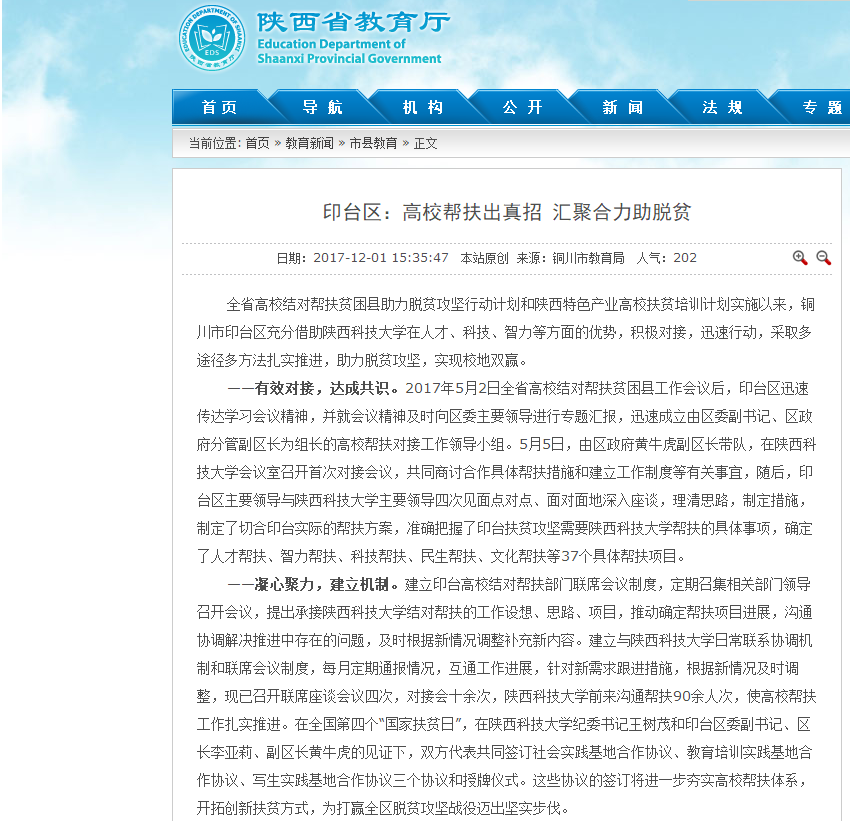 12月1日,陜西省教育廳門戶網(wǎng)站在“教育新聞”的《印臺區(qū):高校幫扶出真招 匯聚合力助脫貧》報道中,報道了我校充分發(fā)揮人才、科技、智力等方面的優(yōu)勢,積極對接,迅速行動,采取多途徑多方法扎實推進(jìn),助力銅川市印臺區(qū)脫貧攻堅,實現(xiàn)校地雙贏。