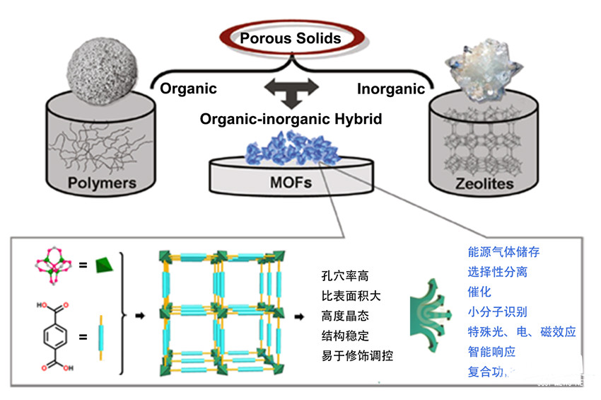 圖1 金屬-有機(jī)框架(MOFs)結(jié)構(gòu)示意圖及其特點(diǎn)與功能應(yīng)用