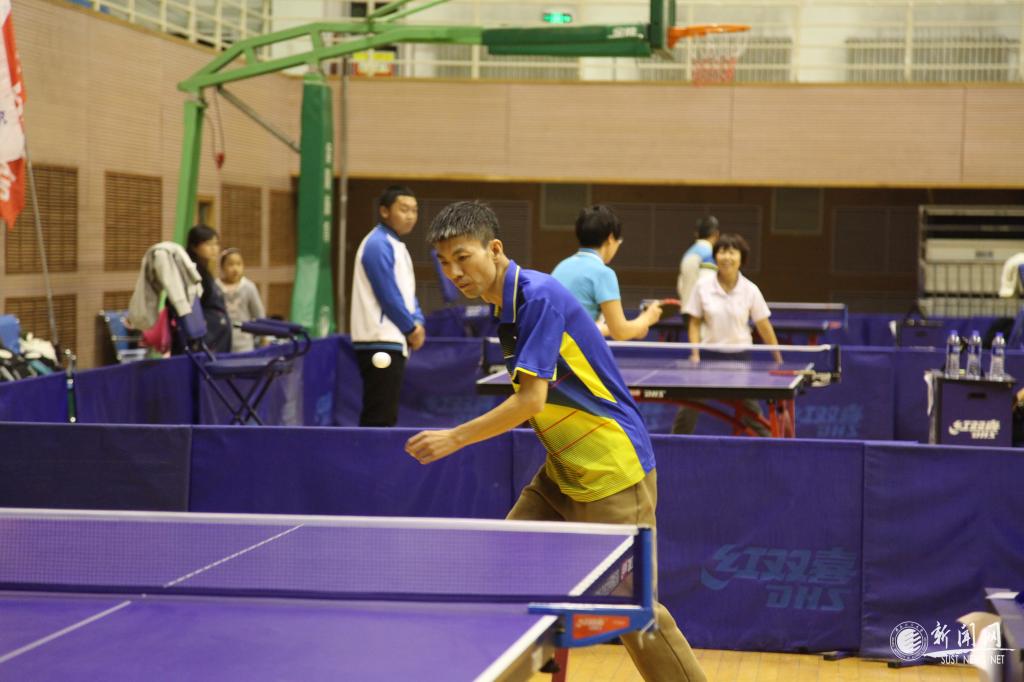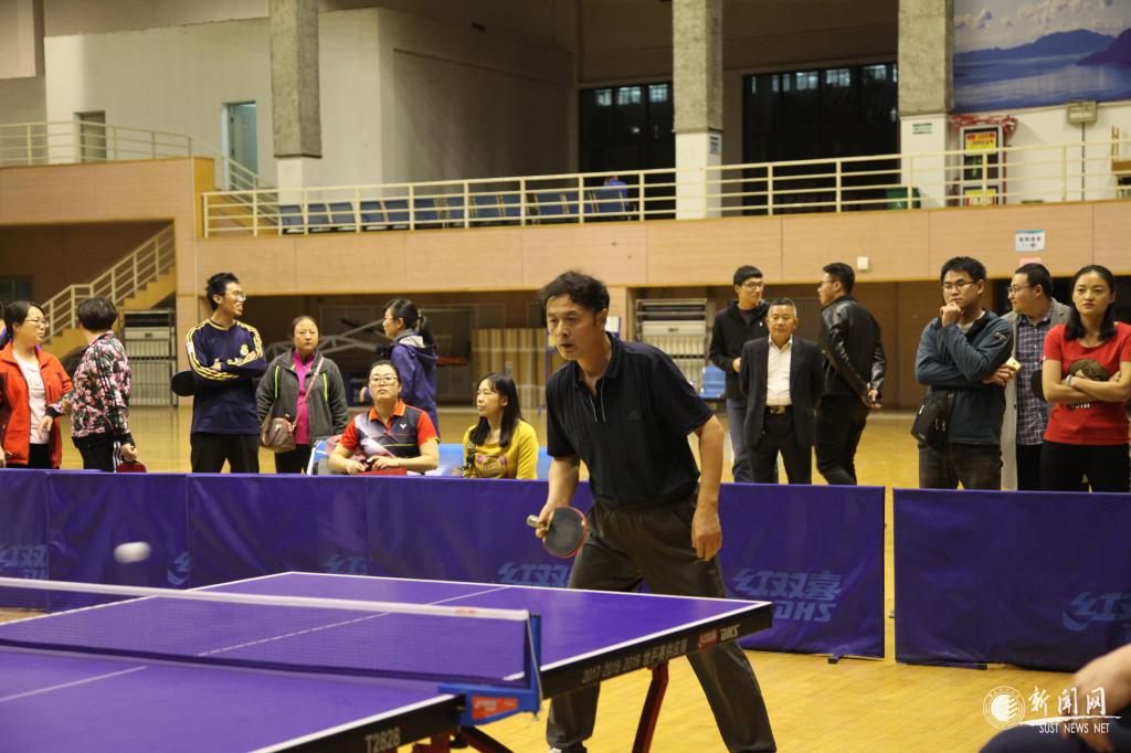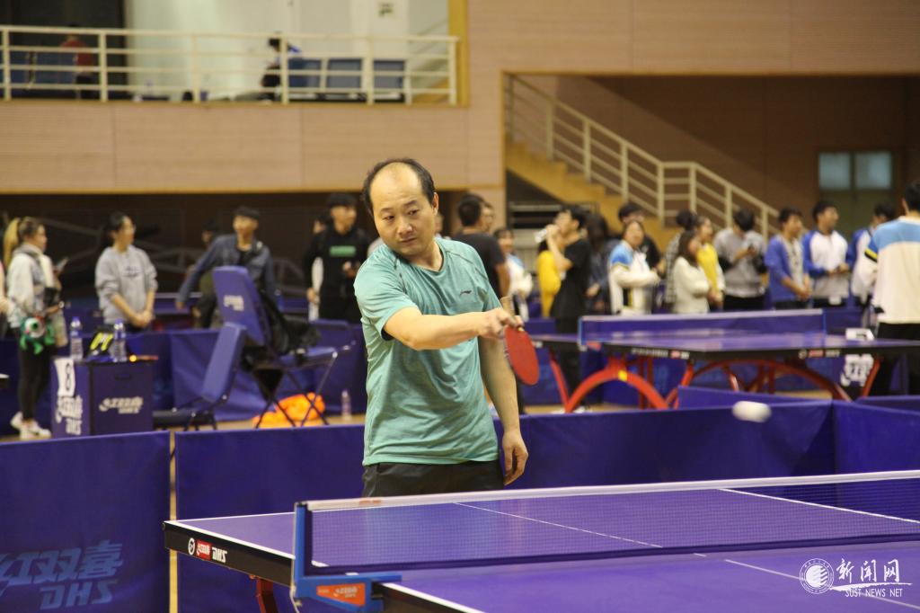 教工男子團(tuán)隊比賽最吸人眼球,遠(yuǎn)遠(yuǎn)地就能聽見觀眾們的喝彩聲,文理學(xué)院吳云天老師每年都參賽,屬于中年組“健將級”選手,只見他拿出專業(yè)水平,每打一球,就會在臺上搓一下手,拍一下球臺,防止手汗影響發(fā)揮。