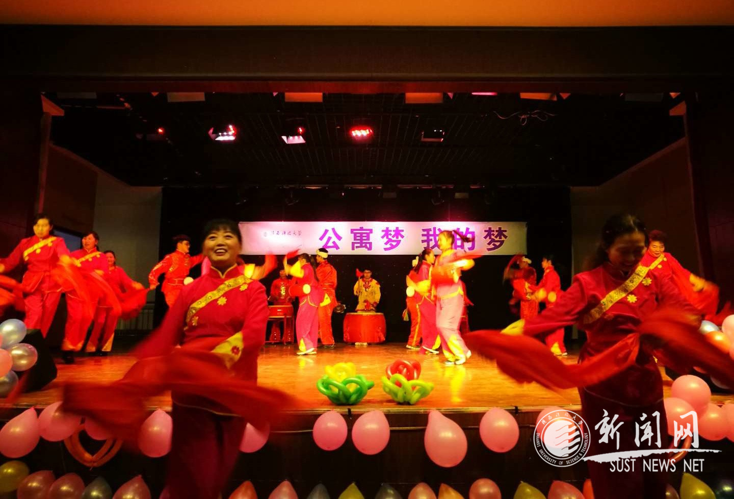 晚會以“公寓夢·我的夢”為主題,在管理員和自管會同學共同精心編排的腰鼓表演中拉開序幕。《中國夢》、《飛揚的鼓聲》、《開開心心每一天》、《天上的西藏》等舞蹈,展示了公寓員工們昂揚向上的精神面貌,三句半《贊科大發(fā)展》獲得在場觀眾掌聲陣陣,詩朗誦《珍惜工作,服務同學》更是將晚會掀起高潮,公寓阿姨們用樸素的言語道出了她們與學生之間化不開的親情與友情。