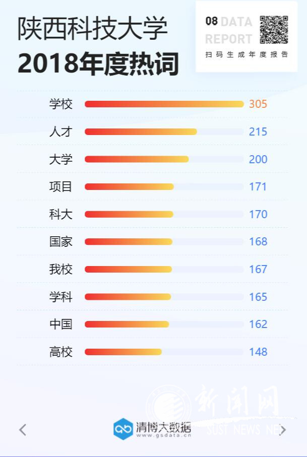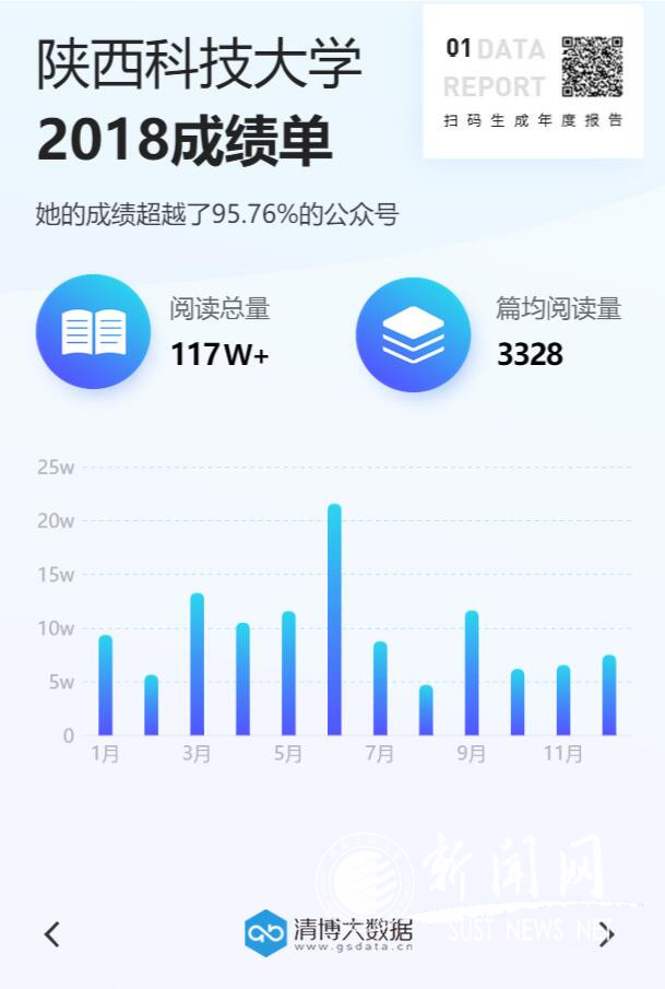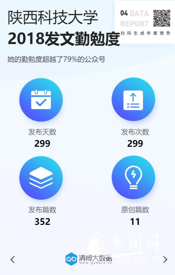 數(shù)據(jù)顯示。微信平臺(tái)以117萬(wàn)總閱讀量,3328篇均閱讀量的總成績(jī)超越了95.76%公眾號(hào),其傳播指數(shù)WCI 812.78超越了96%的公眾號(hào)。2018年微信共發(fā)布299天,推送352篇圖文,收獲2萬(wàn)+個(gè)點(diǎn)贊,勤勉度超越了79%的公眾號(hào)。其中《甲子校慶丨陜西科技大學(xué)宣傳片、畫冊(cè)、大事記震撼首發(fā)》以當(dāng)周4萬(wàn)+閱讀數(shù)榮登最熱文章,“人才”、“項(xiàng)目”、“學(xué)科”等詞匯被評(píng)為我校年度熱詞。
