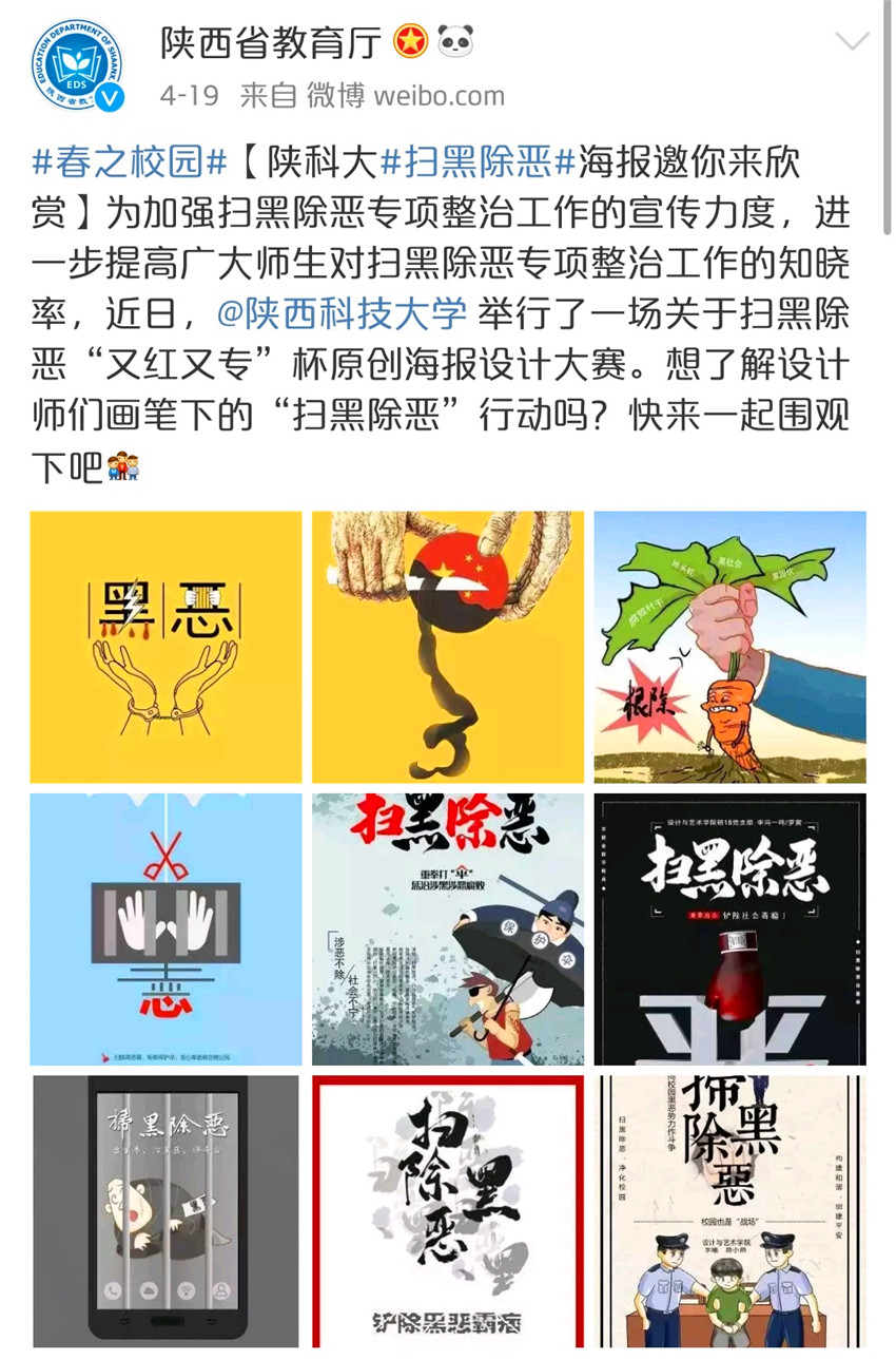 此次活動(dòng)還受到了陜西省教育廳官方微博的轉(zhuǎn)發(fā),加強(qiáng)了設(shè)計(jì)與藝術(shù)學(xué)院掃黑除惡專(zhuān)項(xiàng)斗爭(zhēng)工作的宣傳力度,進(jìn)一步提高了廣大師生對(duì)掃黑除惡專(zhuān)項(xiàng)斗爭(zhēng)工作的知曉率。