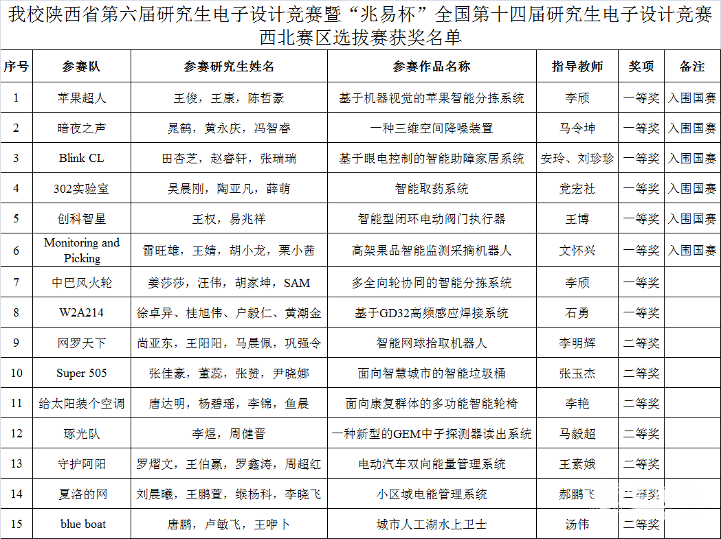 7月7日,陜西省第六屆研究生電子設計競賽暨“兆易杯”全國第十四屆研究生電子設計競賽西北賽區(qū)選拔賽在西安郵電大學落下帷幕,我校15支參賽隊全部進入決賽并獲獎,其中8支隊伍獲一等獎、7支隊伍獲二等獎,進入賽區(qū)決賽比率、獲一等獎率和入圍國賽率均高居西北賽區(qū)第一;同時,在整體入圍國獎比例下降為10%且我校參賽隊伍數量較少的情況下(我校參賽規(guī)模在西北賽區(qū)居第16位),有6支隊伍挺進國賽,較上屆增加1支,入圍數西北地區(qū)第二,僅低于西安交通大學。李頎、文懷興、黨宏社、馬令坤、石勇、王博、安玲、劉珍珍等8位老師被評為“優(yōu)秀指導教師”,我校獲“優(yōu)秀組織獎”。
