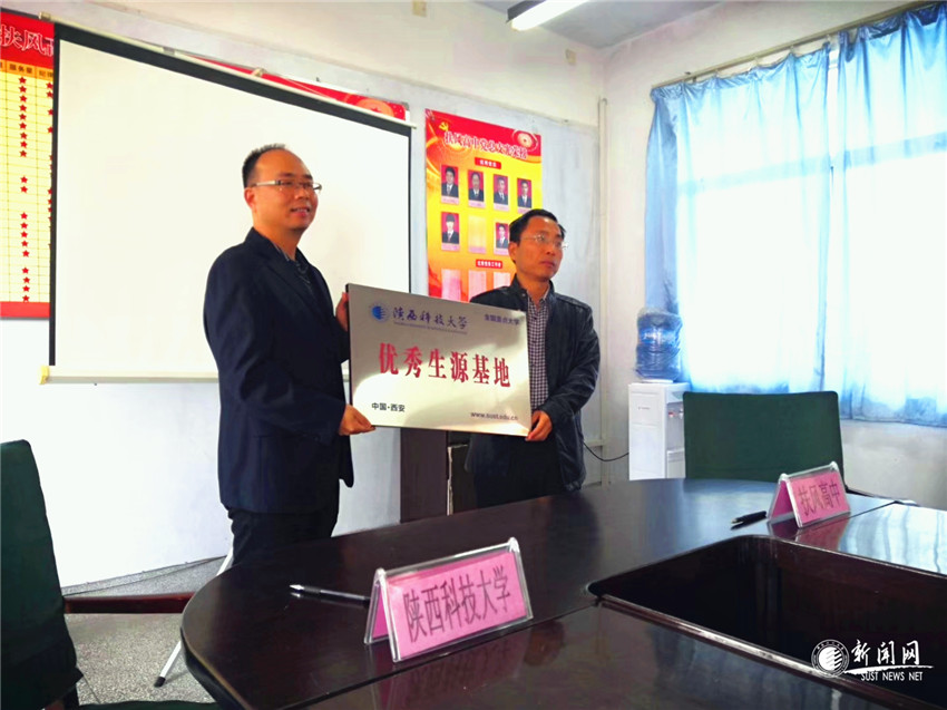 化學(xué)與化工學(xué)院黨委副書記趙鋼向扶風(fēng)高中校長張建軍授“陜西科技大學(xué)優(yōu)秀生源基地”牌匾