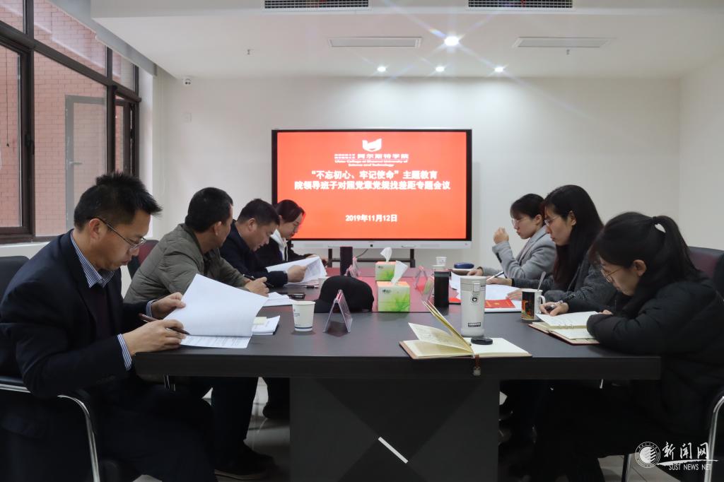 按照學?!安煌跣?、牢記使命”主題教育有關部署,11月12日下午,阿爾斯特學院直屬黨支部對照黨章黨規(guī)找差距專題會議在學院會議室召開,學?!安煌跣?、牢記使命”主題教育第二指導小組組長陳援、成員楊婧出席會議。學院領導班子成員、全體黨員參加會議,會議由院直屬黨支部書記賀濤主持。