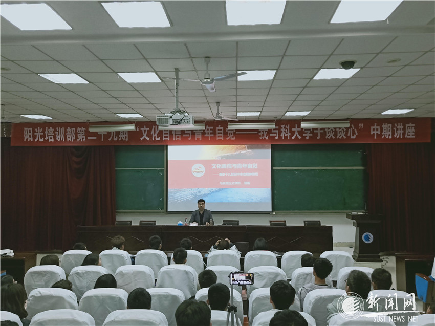 黨的十九屆四中全會精神在我校廣大師生中引起強(qiáng)烈反響,廣大青年學(xué)子熱切期盼能更深刻細(xì)致地領(lǐng)會全會精神,各部門紛紛自覺開展學(xué)習(xí)活動。為此,我校陽光助學(xué)中心于11月17日晚,舉辦“黨的十九屆四中全會精神宣講會”,邀請我校馬克思主義學(xué)院“思想道德修養(yǎng)與法律基礎(chǔ)”教研部主任范昕,為廣大科大學(xué)子做了名為《文化自信與青年自覺——兼談黨的十九屆四中全會精神領(lǐng)悟》的專題講座。來自各個學(xué)院的300余名大學(xué)生參加了講座。