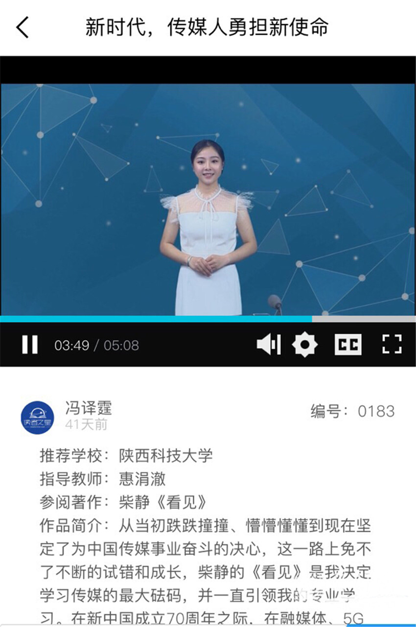 日前,在天津財(cái)經(jīng)大學(xué)舉辦的第四屆全國(guó)“大學(xué)生閱讀推廣高峰論壇(2019)”上,我校圖書館推送的設(shè)計(jì)與藝術(shù)學(xué)院馮譯霆同學(xué)以演講原創(chuàng)作品《新時(shí)代,傳媒人勇?lián)率姑帆@首屆全國(guó)大學(xué)生“悅讀之星”榮譽(yù)表彰。