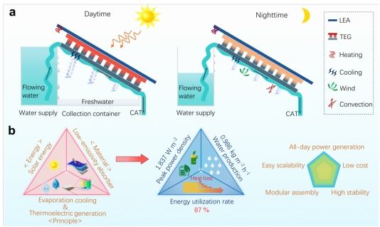 研究團隊創(chuàng)新性地集成了大面積低發(fā)射率太陽能吸收器、溫差發(fā)電片與被動式界面蒸發(fā)器,成功構(gòu)建出可全天候連續(xù)運行的水—電聯(lián)產(chǎn)系統(tǒng)。該系統(tǒng)通過耦合增強的太陽能光熱轉(zhuǎn)換與蒸發(fā)冷卻效應(yīng),在顯著提升熱電輸出功率的同時,實現(xiàn)了淡水的持續(xù)高效收集。尤為關(guān)鍵的是,夜間持續(xù)的蒸發(fā)冷卻效應(yīng)使得系統(tǒng)冷端溫度始終低于環(huán)境熱端溫度,從而維持了驅(qū)動系統(tǒng)晝夜連續(xù)運行的穩(wěn)定溫差。