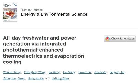 為此,陜西科技大學材料科學與工程學院“光熱材料的功能化調(diào)控與應(yīng)用”創(chuàng)新團隊王成兵教授聯(lián)合北京航空航天大學趙立東教授團隊、蘭州交通大學耿中榮教授,在能源環(huán)境領(lǐng)域頂級期刊《Energy & Environmental Science》(IF = 32.5) 上發(fā)表了題為“All-day freshwater and power generation via integrated photothermal-enhanced thermoelectrics and evaporation cooling”(基于集成光熱增強熱電技術(shù)與蒸發(fā)冷卻的全天候淡水與電力聯(lián)產(chǎn)系統(tǒng))的突破性研究成果。該研究成功構(gòu)建了一種全天候水—電聯(lián)產(chǎn)系統(tǒng),有效克服了上述技術(shù)瓶頸。
