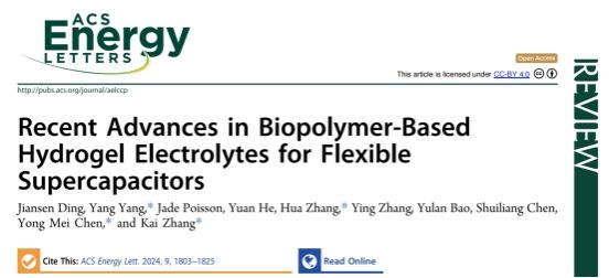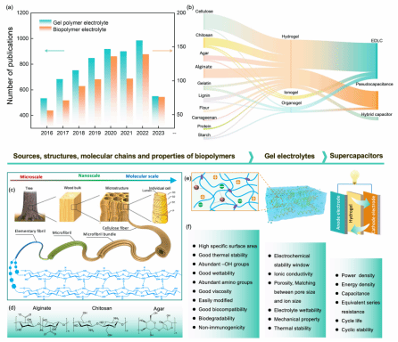 近年來,對化石燃料資源的日益擔(dān)憂激發(fā)了對開發(fā)可用于先進電化學(xué)儲能設(shè)備的綠色、可再生材料的需求。生物質(zhì)材料具有獨特的層級結(jié)構(gòu)和物理化學(xué)性質(zhì),可作為發(fā)展可持續(xù)能源的強有力的平臺,在超級電容器的凝膠電解質(zhì)中得到了廣泛的應(yīng)用。在這篇綜述中,課題組概述了各種天然高分子的結(jié)構(gòu)和特性,討論了超級電容器的的儲能機制,并評估了用于超級電容器的凝膠電解質(zhì)的評價指標(biāo),著重分析了天然高分子材料在凝膠電解質(zhì)中發(fā)揮的作用。此外,還概述了用于超級電容器的天然高分子基水凝膠電解質(zhì)的最新電化學(xué)性能及其它多種功能,同時強調(diào)了當(dāng)前的技術(shù)挑戰(zhàn)和潛在的解決方案。本文旨在全面綜述天然高分子基水凝膠電解質(zhì)的最新進展,重點介紹了有關(guān)綠色和可持續(xù)超級電容器的研究以及進一步發(fā)展的潛在路徑。相關(guān)成果以“Recent Advances in Biopolymer-Based Hydrogel Electrolytes for Flexible Supercapacitors”為題發(fā)表在《ACS Energy Letters》期刊上。
