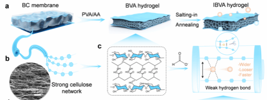 機械性能和離子傳輸性能是凝膠電解質(zhì)的核心性能指標(biāo),對其應(yīng)用性能和穩(wěn)定性具有重要影響。尤其在水凝膠中,高含水量雖然能夠提供更好的離子傳輸通道,但卻往往導(dǎo)致機械強度顯著下降。與此同時,為了提高機械性能,通常需要增加水凝膠的交聯(lián)度,但過高的交聯(lián)程度會導(dǎo)致離子通道的縮小,從而影響其離子傳輸能力。這種“性能需求互斥”的現(xiàn)象使得在水凝膠電解質(zhì)的設(shè)計中,如何在保持較高機械強度的同時確保良好的離子傳導(dǎo)性成為一項極具挑戰(zhàn)的任務(wù)。為此,課題組研究了一種利用具有弱離子相互作用的層狀細菌纖維素網(wǎng)絡(luò)制備高強度、高離子導(dǎo)電的水凝膠(IBVA)的簡單方法。具體來說,具有高結(jié)晶度和機械強度的細菌纖維素(BC)膜被用作水凝膠基質(zhì)的堅固骨架。同時,引入具有“鹽溶”作用的陰離子(HCOO-),調(diào)整聚合物的聚集狀態(tài),使聚合物-離子-溶劑形成弱氫鍵相互作用,最終形成“硬-軟-硬”互鎖的層次結(jié)構(gòu)。該策略使水凝膠能夠?qū)崿F(xiàn)105 ± 5 mS cm-1的超高離子電導(dǎo)率,同時能夠滿足機械強度需求(0.78 MPa),優(yōu)于大多數(shù)報道的水凝膠電解質(zhì)。此外,IBVA作為超級電容器的電解質(zhì),表現(xiàn)出良好的柔韌性、廣泛的溫度適應(yīng)性、界面穩(wěn)定性和穩(wěn)定的電化學(xué)性能。相關(guān)研究成果以“Design of Hydrogel Electrolytes Using Strong Bacterial Cellulose with Weak Ionic Interactions”為題發(fā)表在《ACS Nano》期刊上。