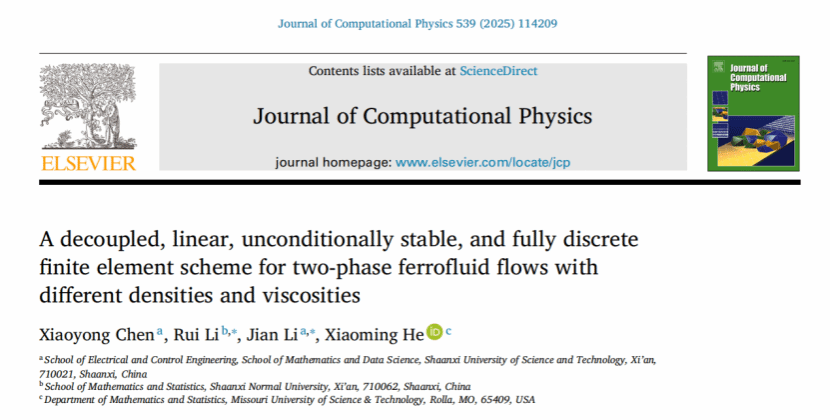近日,我校李劍教授團隊的研究成果“A decoupled, linear, unconditionally stable, and fully discrete finite element scheme for two-phase ferrofluid flows with different densities and viscosities”發(fā)表于計算物理領(lǐng)域國際頂級期刊 Journal of Computational Physics。我校博士生陳曉勇為第一作者,該研究工作與美國密蘇里科技大學(xué)何曉明教授共同完成,李劍教授與陜西師范大學(xué)李瑞副教授為共同通訊作者。陜西科技大學(xué)為論文的第一通訊單位。
