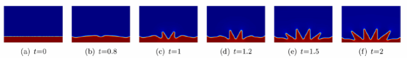 然而,針對密度差顯著的兩相鐵磁流體系統(tǒng),由于其復(fù)雜的多物理場強耦合特性(涉及流體動力學(xué)相分離與磁效應(yīng))及界面動力學(xué)行為,現(xiàn)有程序與軟件數(shù)值模擬均已失效。圍繞上述難點問題,本研究團隊聚焦于大密度差兩相鐵磁流體流動問題,建立不同密度和黏度的兩相鐵磁流體動力學(xué)模型。重構(gòu)磁勢方程、引入人工可壓縮方法、采用隱式-顯式格式處理非線性項,提出了一種大密度差兩相鐵磁流體流動問題線性化解耦有限元方法。該格式無需對壓力場施加人為邊界條件,嚴(yán)格證明了它在每個時間步都是無條件穩(wěn)定和唯一可解的。在現(xiàn)有數(shù)值模擬和軟件失效的情況下,重新研制程序給出了相應(yīng)的數(shù)值模擬。