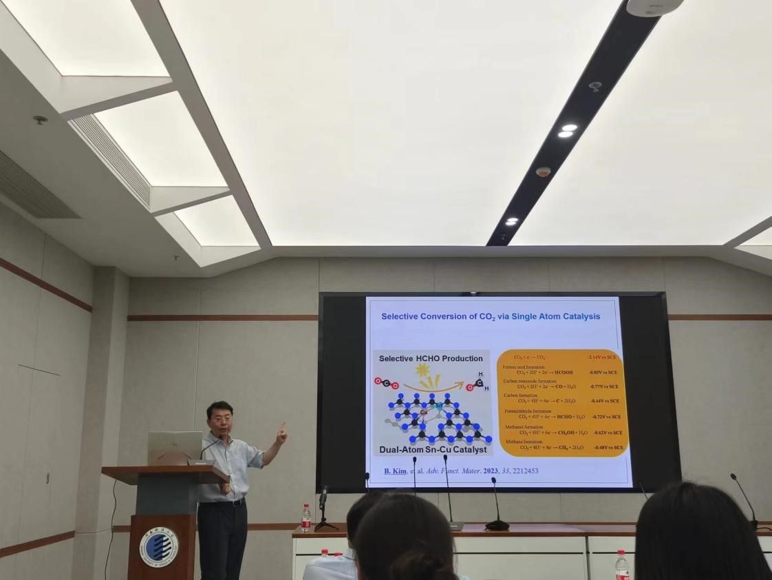 報告會上,Wonyong Choi教授首先說明了太陽能及光(電)催化在實現(xiàn)自然界各種化學元素(如C、N、O和H)可持續(xù)循環(huán)中扮演著重要角色;其次,Wonyong Choi教授圍繞C、N和O等小分子化合物的光催化/光電化學(PEC)轉化,介紹了各種工程化光(電)催化系統(tǒng),其可實現(xiàn)NO3?、NO2?、NO、NH4?和 N2的選擇性轉化;隨后,詳細描述了通過O2還原可持續(xù)生產H2O2的光催化/光電化學系統(tǒng),其在無偏壓條件下能夠連續(xù)生產H2O2超過100小時;最后,Wonyong Choi教授舉例說明了使用異核雙原子位點催化劑控制CO2轉化的多電子轉移機制。