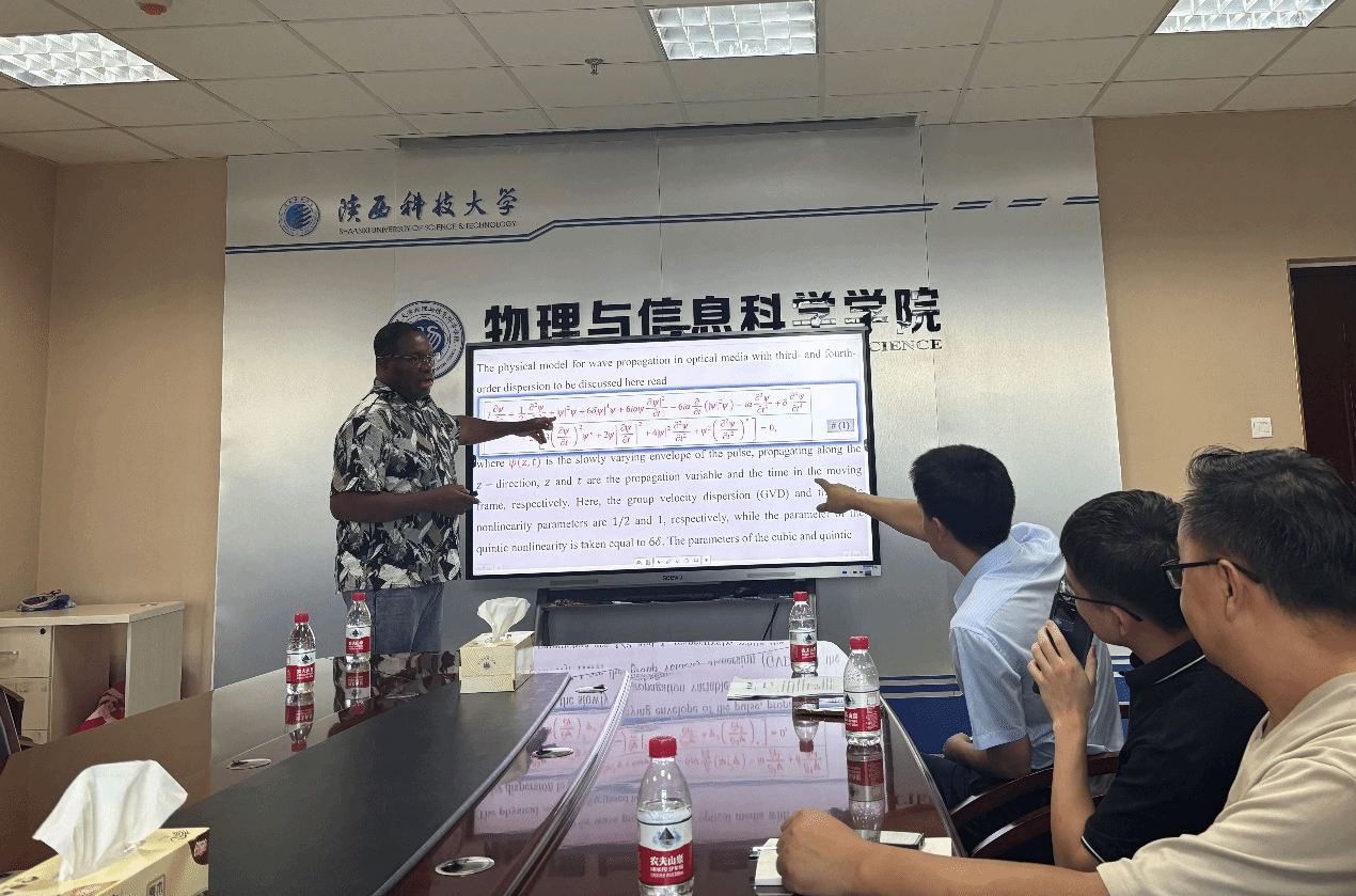 會(huì)議結(jié)束后,參會(huì)師生與 Emmanuel Kengne 教授就光學(xué)介質(zhì)中混合局域波與三階和四階色散的相互作用及其相關(guān)內(nèi)容開展了交流討論。此次研討會(huì)內(nèi)容全面,營(yíng)造了良好的學(xué)術(shù)交流與討論氛圍,開闊了我校師生的科學(xué)視野,參會(huì)師生受益匪淺。