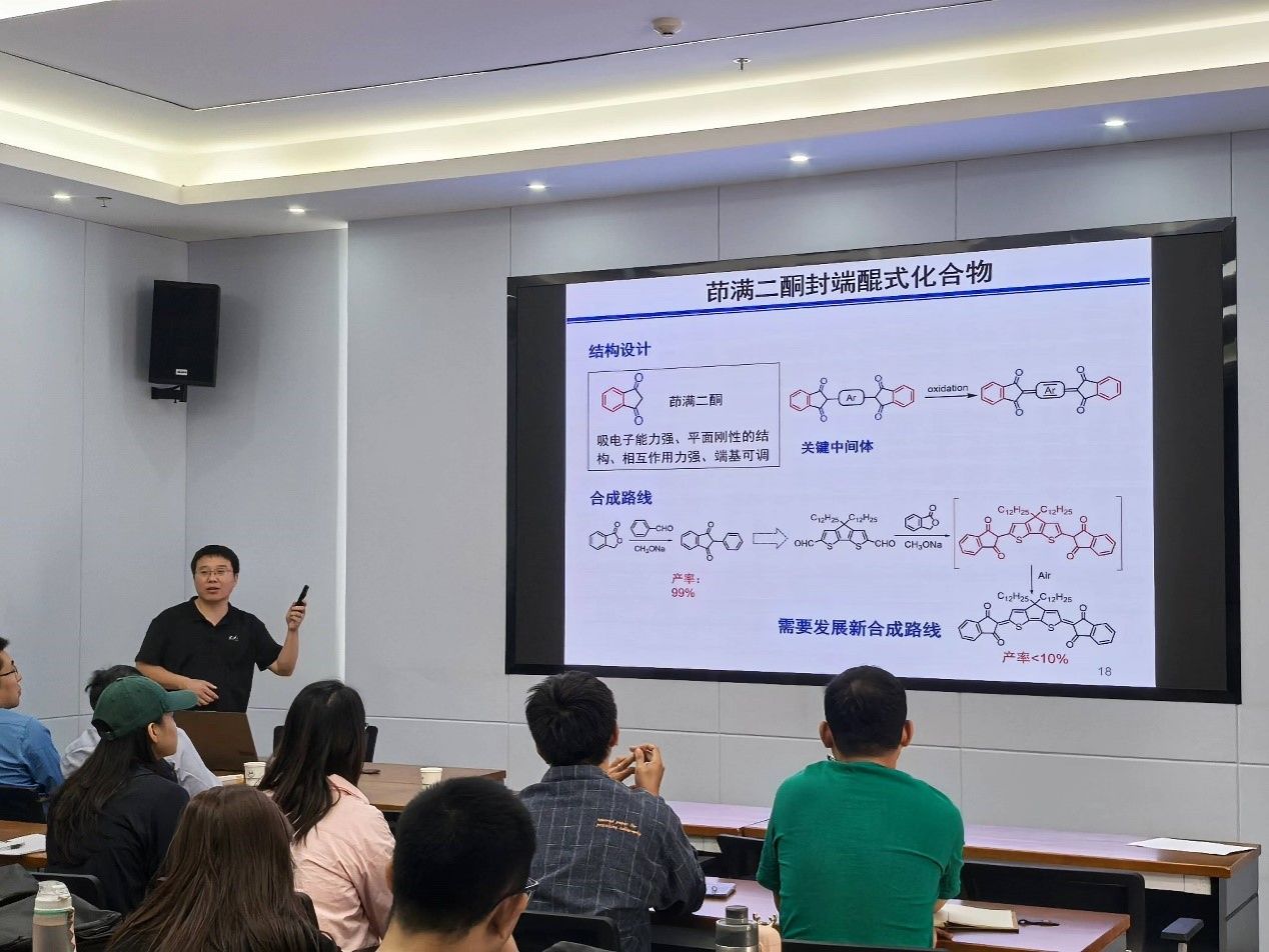 醌式結(jié)構(gòu)共軛小分子具有帶隙窄、平面性好和剛性強(qiáng)的特點(diǎn),在末端引入腈基(CN)、酯基(COOR)等吸電子基團(tuán)后可使化合物具有極低的HOMO和LUMO能級(jí),是目前重要的n型小分子半導(dǎo)體材料品種,然而目前文獻(xiàn)報(bào)道的醌式結(jié)構(gòu)末端含有強(qiáng)吸電子的單元,例如雙氰基,難以引入聚合官能團(tuán)。在報(bào)告中鄧云峰教授詳細(xì)介紹了1,3-茚滿二酮為端基新型醌式共軛體系的高效合成方法及其在構(gòu)筑n型有機(jī)/聚合物半導(dǎo)體材料中的應(yīng)用。與會(huì)師生熱情的與陸雪峰教授進(jìn)行了交流探討,本次學(xué)術(shù)交流活動(dòng)圓滿成功。