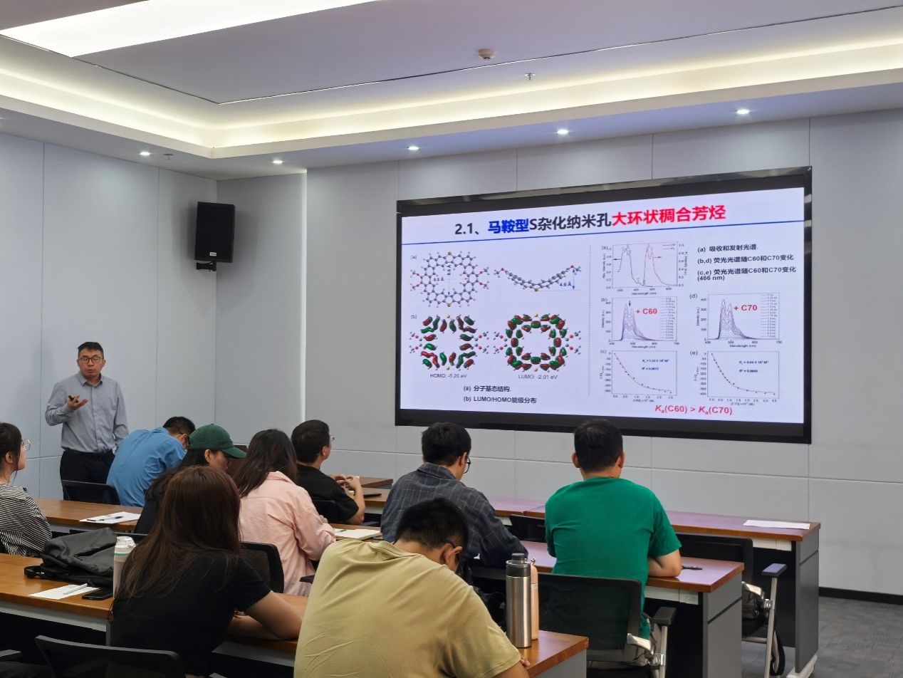 環(huán)狀稠合芳烴作為一類新型的有機(jī)光電磁半導(dǎo)體材料,由于其獨(dú)特的電子和空間幾何結(jié)構(gòu)特征而有望在有機(jī)光電子器件和超分子傳感檢測(cè)等領(lǐng)域獲得突破性應(yīng)用,其中主要的挑戰(zhàn)是環(huán)狀稠合芳烴的化學(xué)濕法精準(zhǔn)合成困難,光電功能探索欠缺。在報(bào)告中陸雪峰教授詳細(xì)介紹了構(gòu)建幾何結(jié)構(gòu)可控的環(huán)狀稠合芳烴新方法及其分子幾何結(jié)構(gòu)、超分子組裝、聚集態(tài)結(jié)構(gòu)、陰離子檢測(cè)和載流子傳輸性能的構(gòu)效關(guān)系。與會(huì)師生熱情的與陸雪峰教授進(jìn)行了交流探討,本次學(xué)術(shù)交流活動(dòng)圓滿成功。