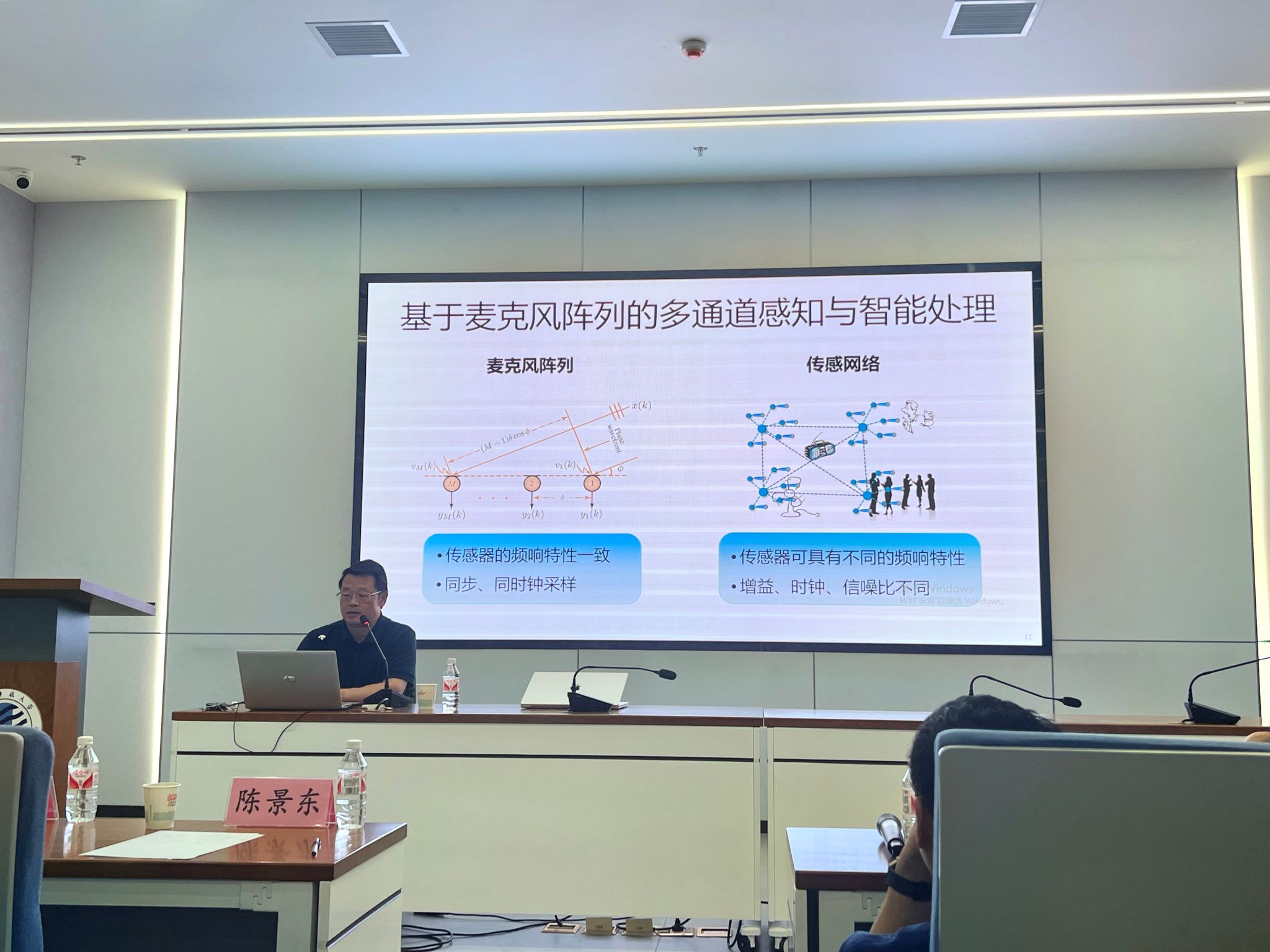 聲信號(hào)獲取與處理技術(shù)是語(yǔ)音通信和人機(jī)語(yǔ)音交互的基石。在本次報(bào)告中,陳景東教授首先介紹了日常生活中的常見噪聲類型,及遠(yuǎn)程會(huì)議、錄音擴(kuò)放、智能家居、智能座艙等領(lǐng)域的應(yīng)用場(chǎng)景,并從單通道語(yǔ)音信號(hào)處理的局限性引出了多通道語(yǔ)音信號(hào)處理任務(wù),指出了下一代拾音系統(tǒng)不僅需要獲取來(lái)自某些聲源的聲信號(hào),也需要感知傳感器周圍的聲場(chǎng)信息,以實(shí)現(xiàn)場(chǎng)景檢測(cè)、聲事件分類、識(shí)別與解譯等任務(wù)。報(bào)告中,陳景東教授就聲信號(hào)獲取、聲場(chǎng)感知技術(shù)的進(jìn)展,以及多通道聲場(chǎng)感知與智能處理領(lǐng)域所面臨的主要挑戰(zhàn)等問(wèn)題作了深入淺出地介紹。報(bào)告結(jié)束后,陳景東教授認(rèn)真詳細(xì)的回答了現(xiàn)場(chǎng)老師和學(xué)生的問(wèn)題。