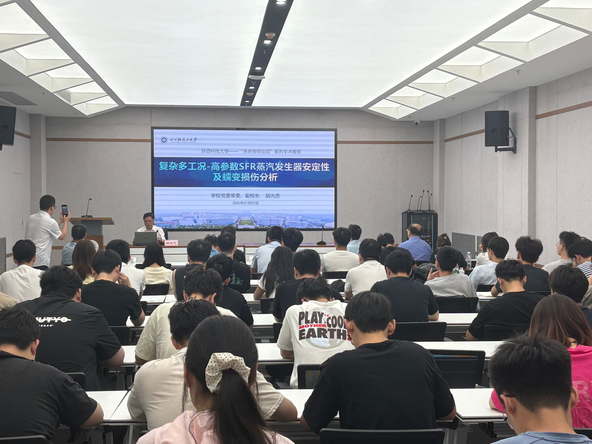 7月7日,應(yīng)研究生院和機電工程學院(智能制造與機器人工程學院)邀請,四川輕化工大學副校長胡光忠教授做客我校“未央導師論壇”,作了題為“復雜多工況-高參數(shù)SFR蒸汽發(fā)生器安定性及蠕變損傷分析”的學術(shù)報告,報告會由研究生院院長強濤濤教授主持,機電學院院長楊立軍、副院長袁越錦及學院相關(guān)專業(yè)教師和研究生參加了本次報告會。